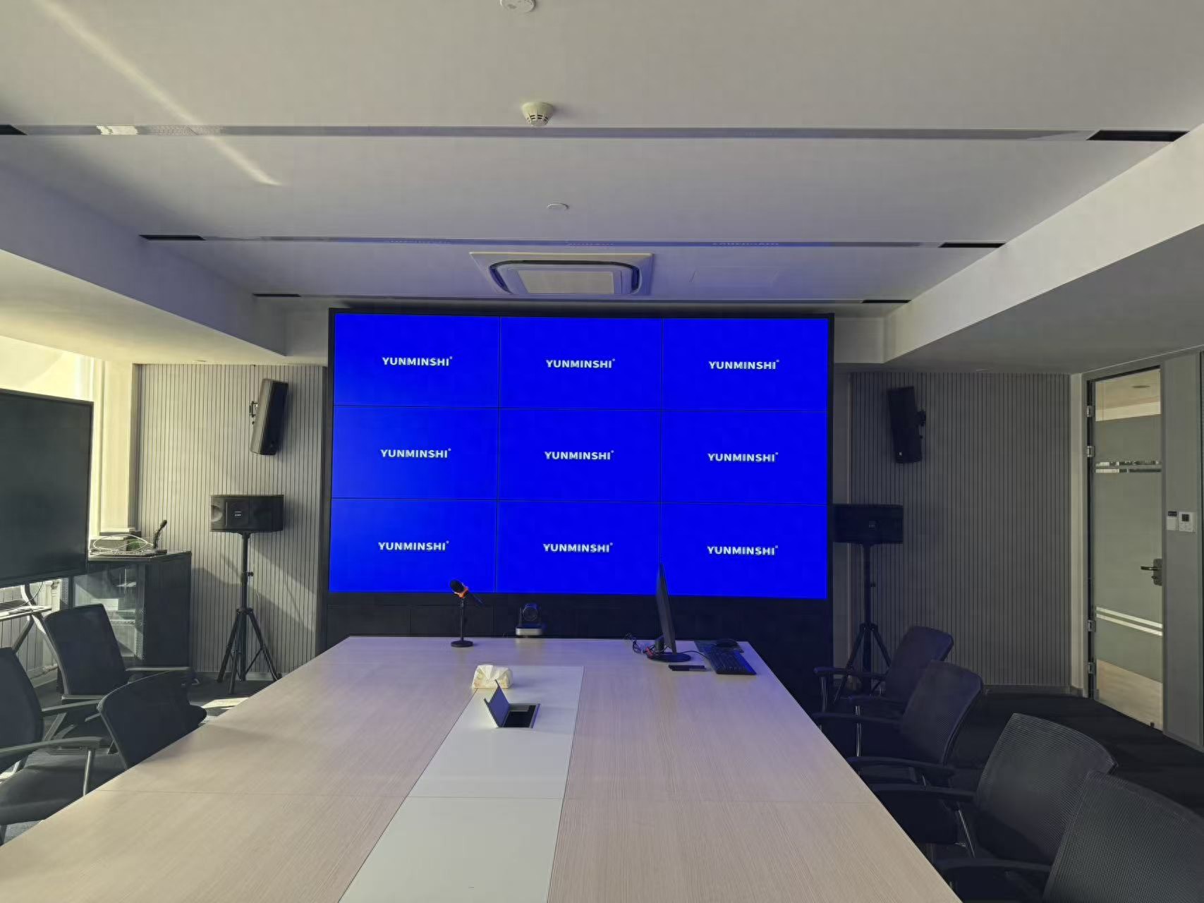 近日,烟台某企业完成会议中心智能化升级,正式启用云敏视 49 寸 3.5mm 超窄边液晶拼接屏系统。该系统采用机柜式安装方案,并配套高清会议摄像头与专业音响设备,全面提升客户洽谈与远程协作效率。